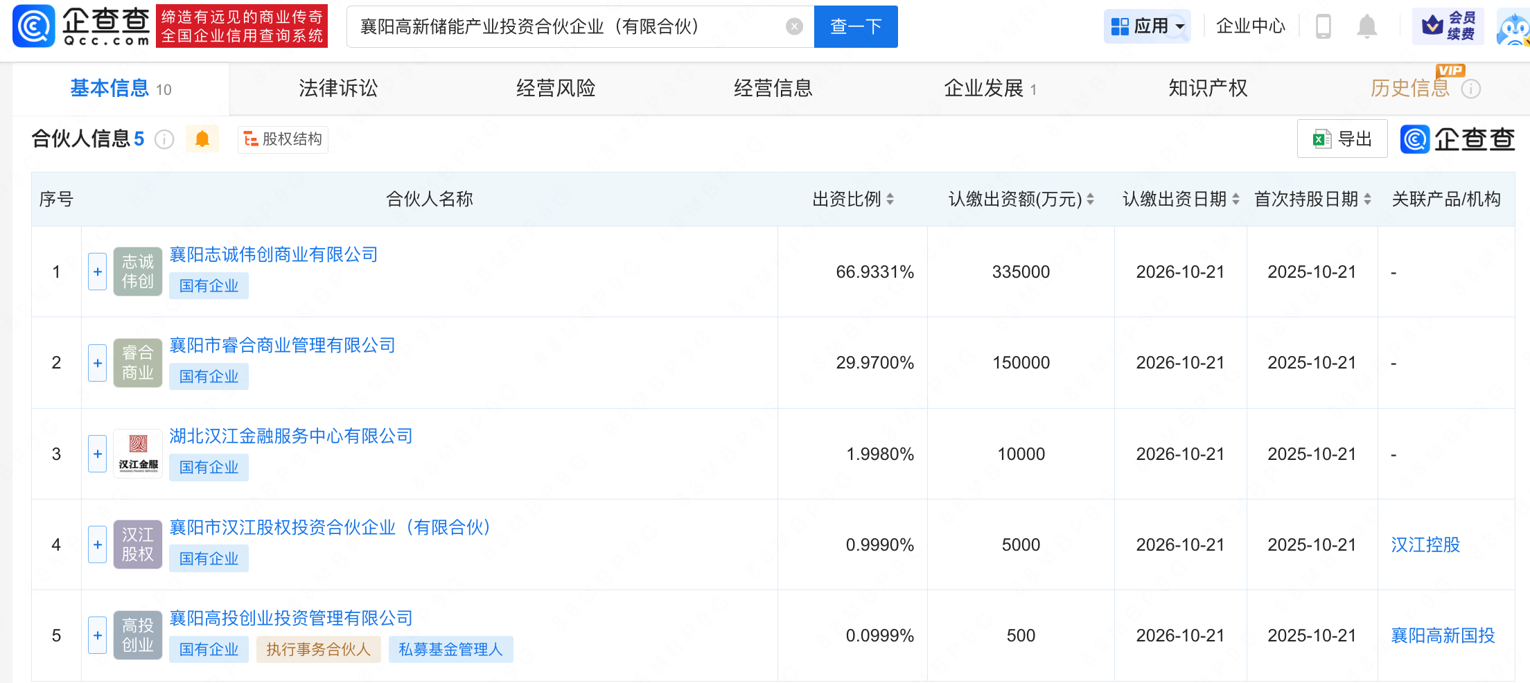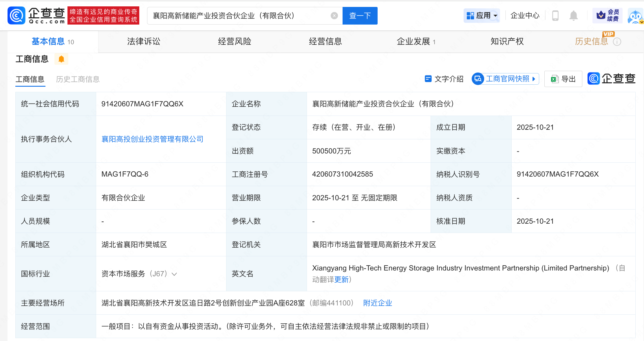 企查查APP显示,近日,襄阳高新储能产业投资合伙企业(有限合伙)成立,执行事务合伙人为襄阳高投创业投资管理有限公司,出资额50.05亿人民币,经营范围为以自有资金从事投资活动。企查查股权穿透显示,该企业由襄阳市汉江股权投资合伙企业(有限合伙)、襄阳志诚伟创商业有限公司、襄阳高投创业投资管理有限公司等共同出资。