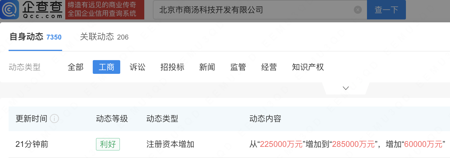 商汤注册资本新增6亿元,注册总资本增至28.5亿