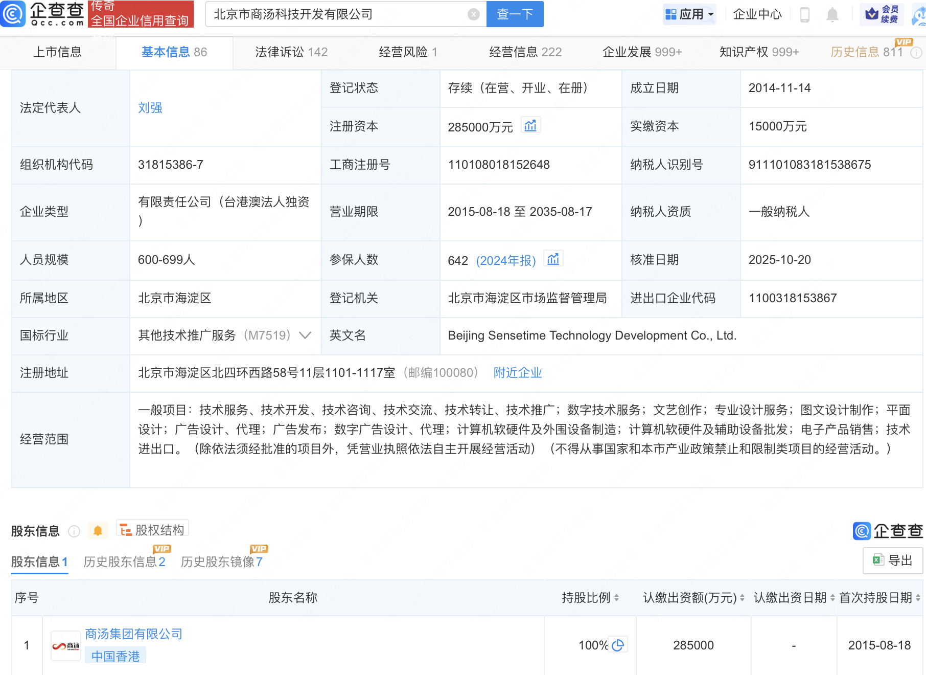 企查查APP显示,近日,北京市商汤科技开发有限公司发生工商变更,注册资本由22.5亿元增至28.5亿元。企查查信息显示,该公司成立于2014年,法定代表人为刘强,由商汤集团有限公司全资持股。