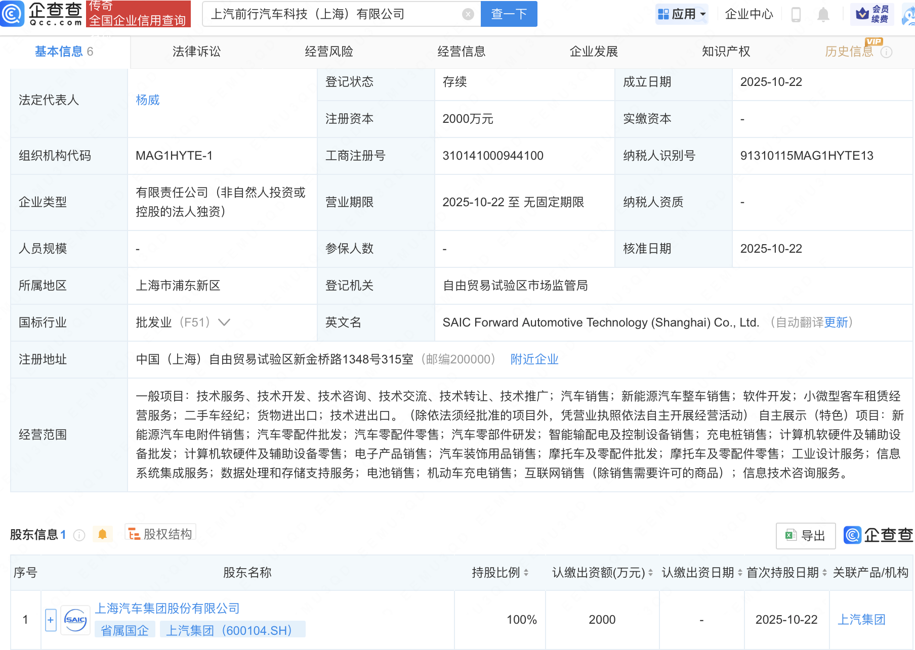 企查查APP显示,近日,上汽前行汽车科技(上海)有限公司成立,注册资本2000万元,经营范围包含:汽车零部件研发;智能输配电及控制设备销售;充电桩销售;计算机软硬件及辅助设备批发等。企查查股权穿透显示,该公司由上汽集团(600104)全资持股。