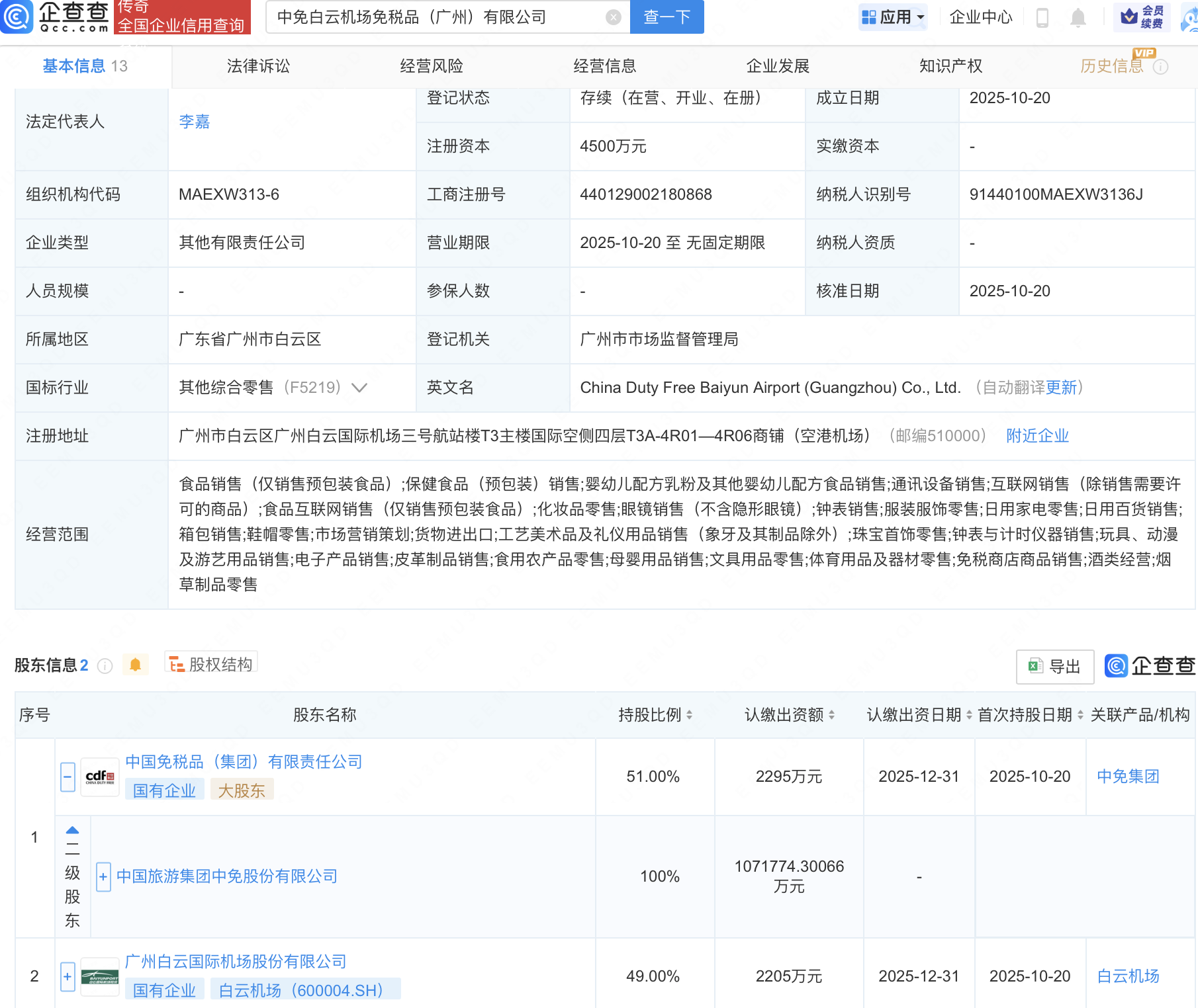 企查查APP显示,近日,中免白云机场免税品(广州)有限公司成立,注册资本4500万元,经营范围包含:玩具、动漫及游艺用品销售;电子产品销售;皮革制品销售;食用农产品零售等。企查查股权穿透显示,该公司由中国中免(601888)全资子公司中国免税品(集团)有限责任公司、白云机场(600004)共同持股。