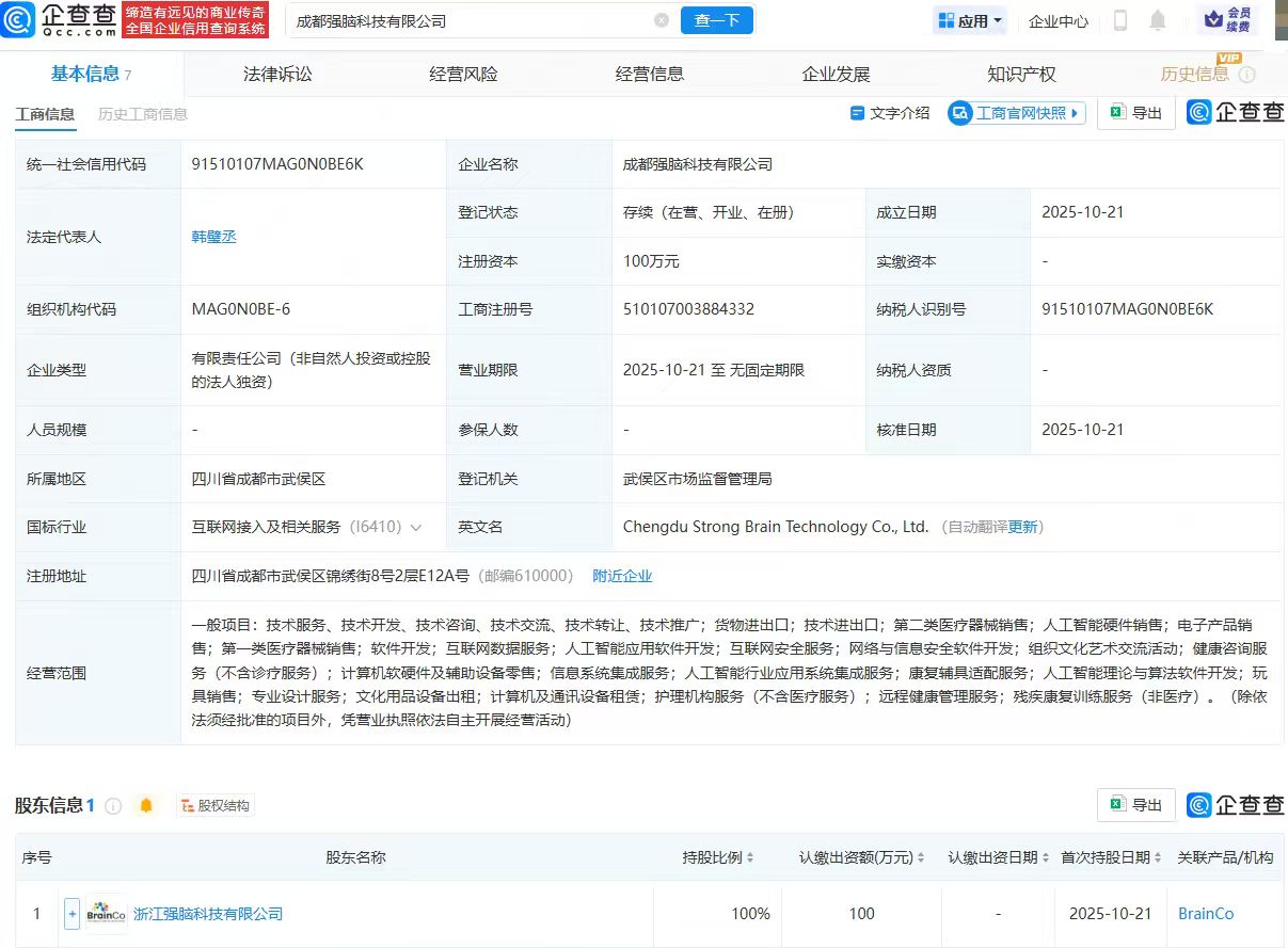 企查查APP显示,近日,成都强脑科技有限公司成立,法定代表人为韩璧丞,经营范围包含:第二类医疗器械销售;人工智能硬件销售;互联网数据服务;人工智能应用软件开发;互联网安全服务等。企查查股权穿透显示,该公司由浙江强脑科技有限公司全资持股。