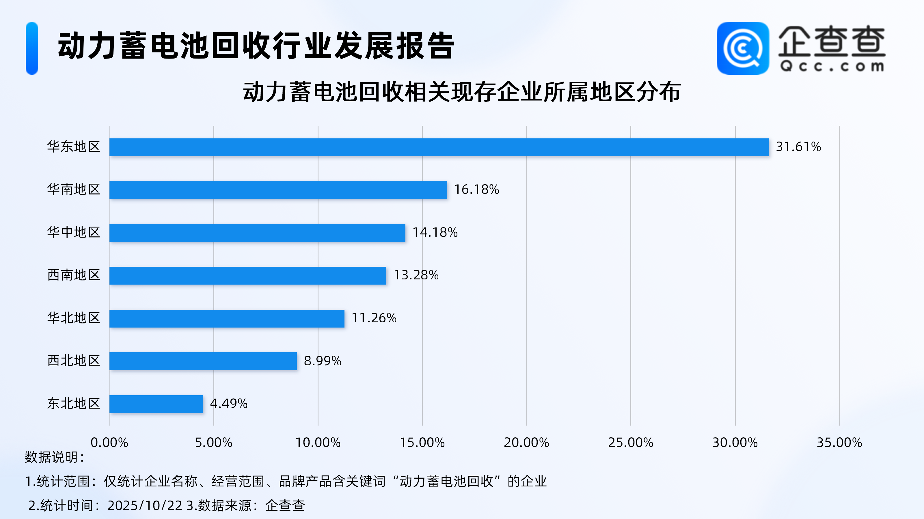 企查查数据显示,截至10月22日,国内动力蓄电池回收相关企业现存量达19.23万家,主要分布在华东地区,占比达31.61%,其次为华南地区,占比达16.18%,分布在华中地区、西南地区、华北地区的相关企业,占比在10%-15%之间。