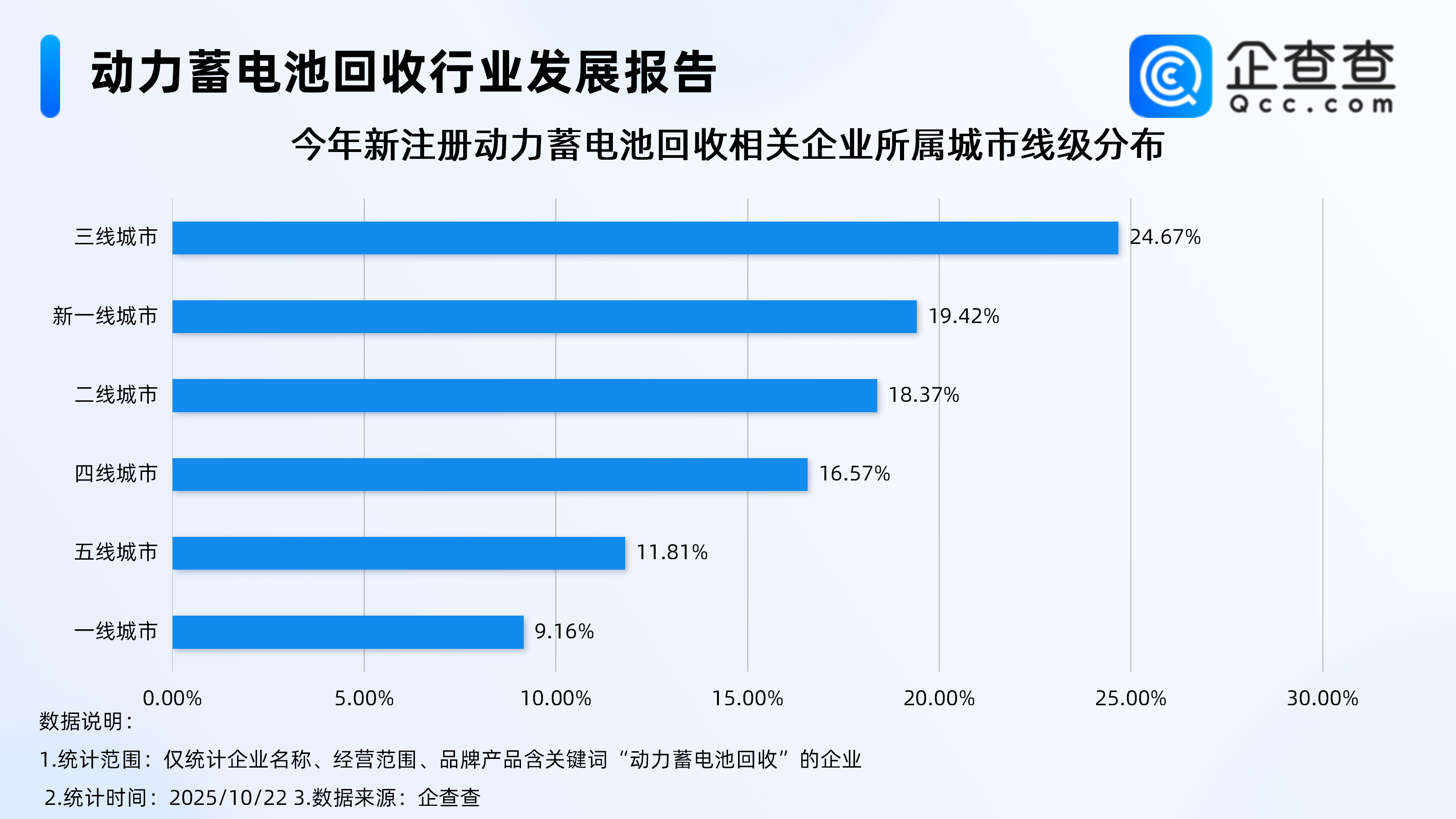 企查查数据显示,从城市线级分布来看,今年新注册动力蓄电池回收相关企业主要分布在三线城市,占比达24.67%,其次为分布在新一线城市、二线城市的相关企业,占比分别达19.42%、18.37%。