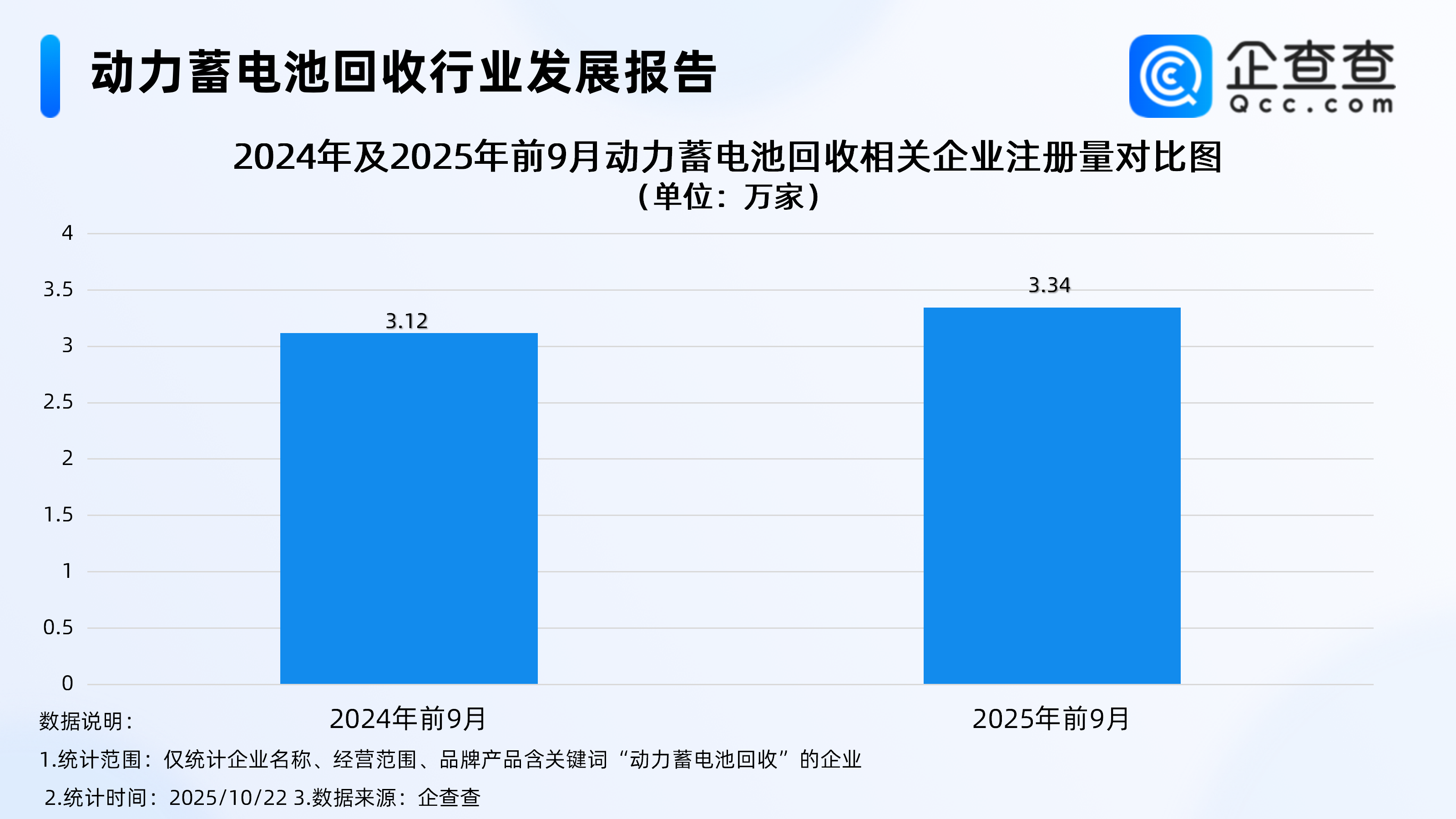 企查查数据显示,注册量方面,近十年动力蓄电池回收相关企业年注册量整体呈上升趋势,2022年-2024年,每年注册量均在4万家以上,其中,2024年注册量达4.33万家。截至目前,今年已注册3.5万家,其中前九月注册量达3.34万家,同比增长7.3%。