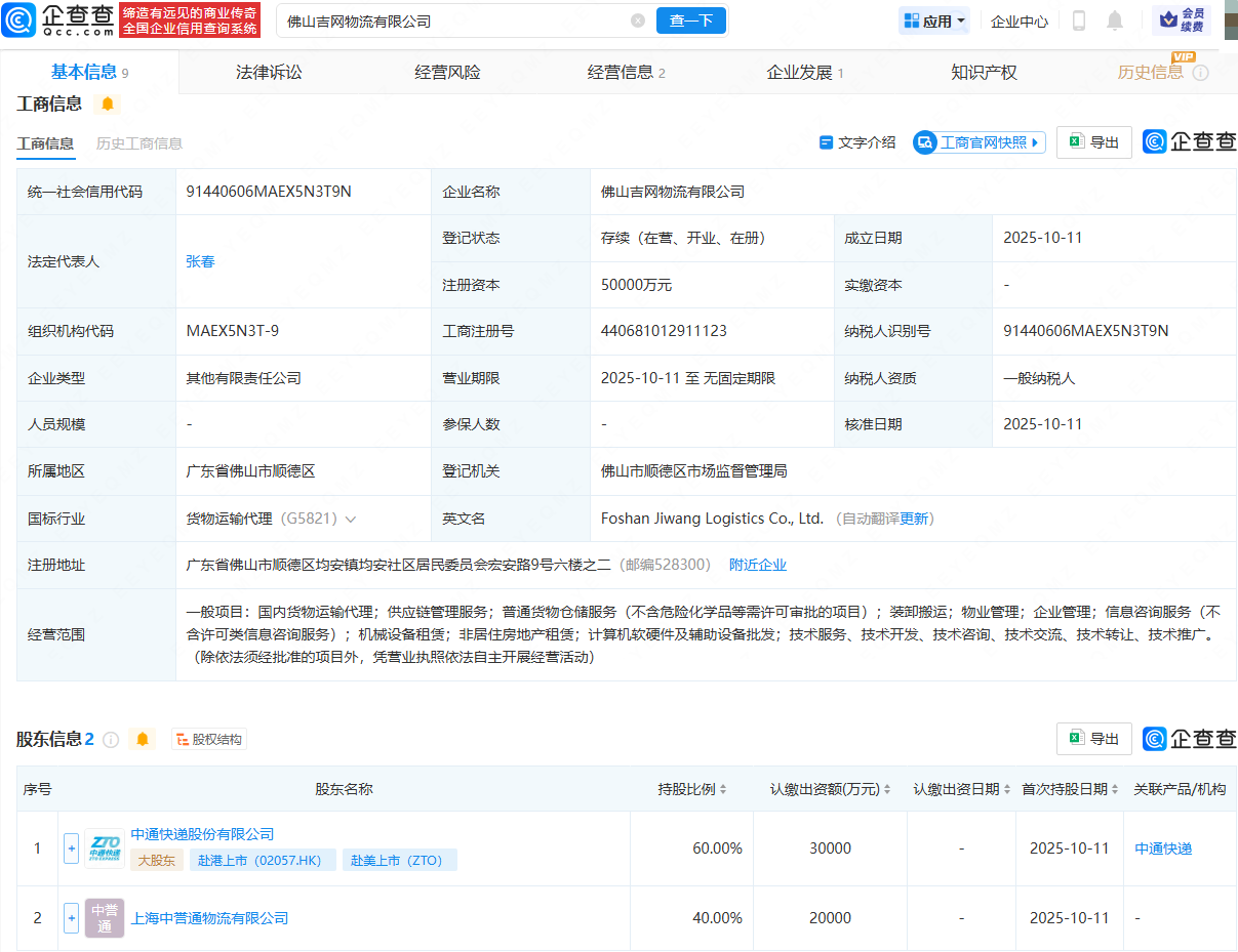 企查查APP显示,近日,佛山吉网物流有限公司成立,法定代表人为张春,注册资本为5亿元,经营范围包含:国内货物运输代理;供应链管理服务;装卸搬运;物业管理;企业管理等。企查查股权穿透显示,该公司由中通快递股份有限公司、上海中誉通物流有限公司共同持股。