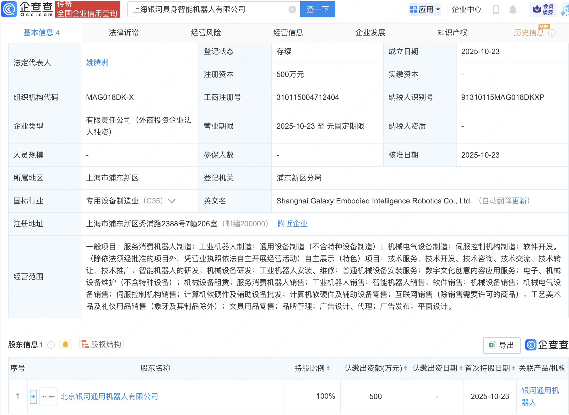 企查查APP显示,近日,上海银河具身智能机器人有限公司成立,经营范围包含:智能机器人的研发;工业机器人安装、维修;数字文化创意内容应用服务等。企查查股权穿透显示,该公司由北京银河通用机器人有限公司全资持股。