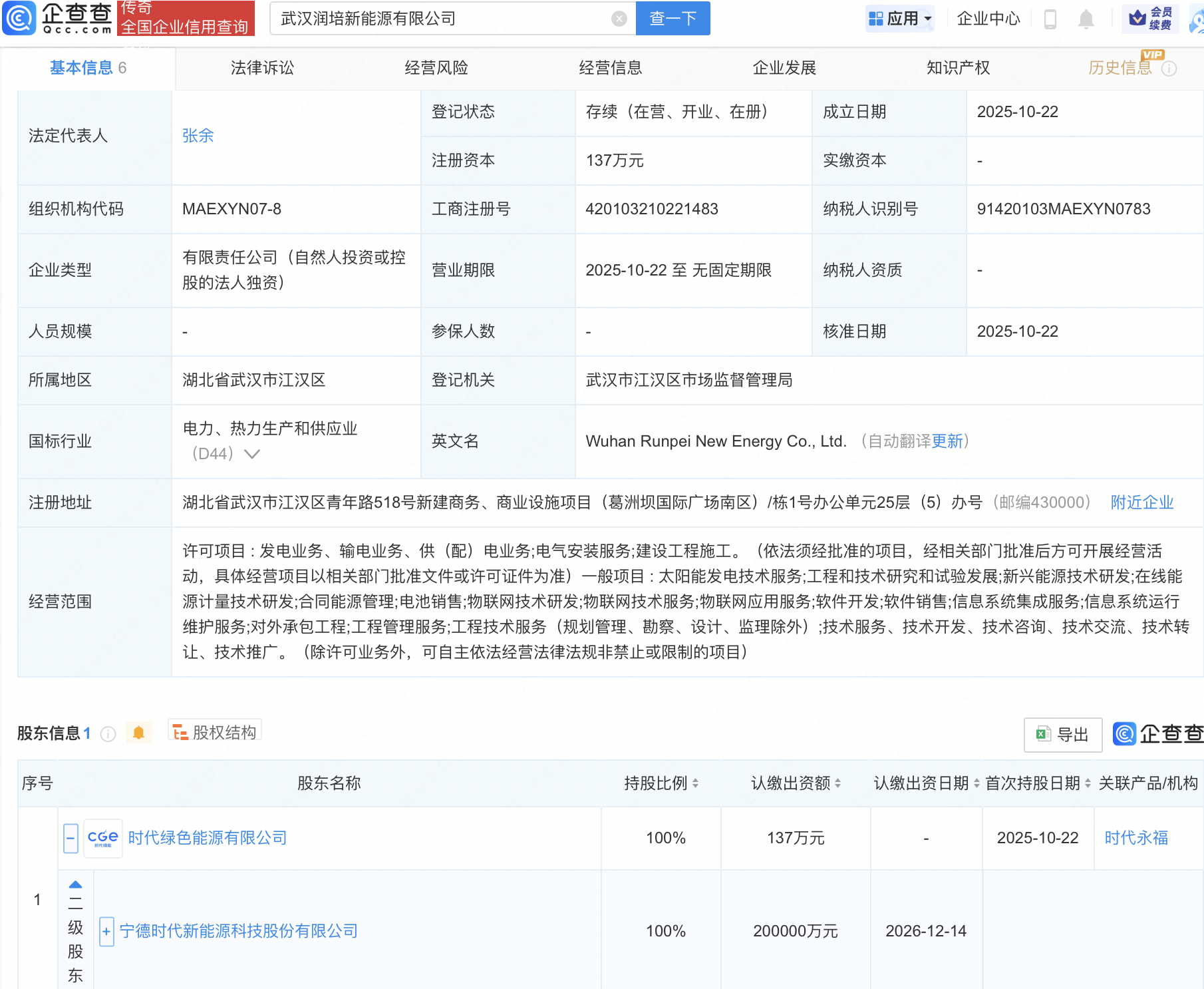 企查查APP显示,近日,武汉润培新能源有限公司成立,法定代表人为张余,经营范围包含:电池销售;物联网技术研发;物联网技术服务;物联网应用服务等。企查查股权穿透显示,该公司由宁德时代(300750)间接全资持股。
