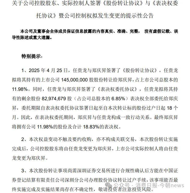 与此同时,双方还签署了《表决权委托协议》,任贵龙将其持有的剩余股份82974679股(占公司总股本的6.85%)表决权全部委托给郑庆昇,委托期限自表决权委托协议签署日起至自本次转让标的股份过户日起18个月。
