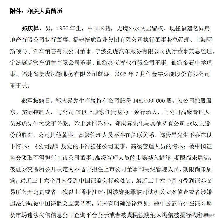 2025年7月,成功易主的金字火腿迎来了董事会换届,由郑庆昇出任董事长,郑庆昇之子郑虎出任金字火腿副总裁,郭波替代周国华成为公司总裁;同年12月,郑虎接替郭波任公司总裁,郭波辞职。