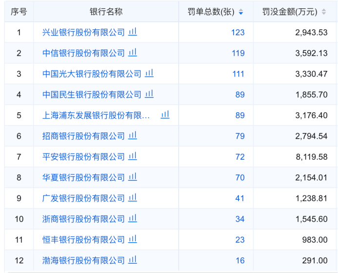 2024年股份制银行收到监管处罚情况,兴业银行共123张罚单,图自企业预警通