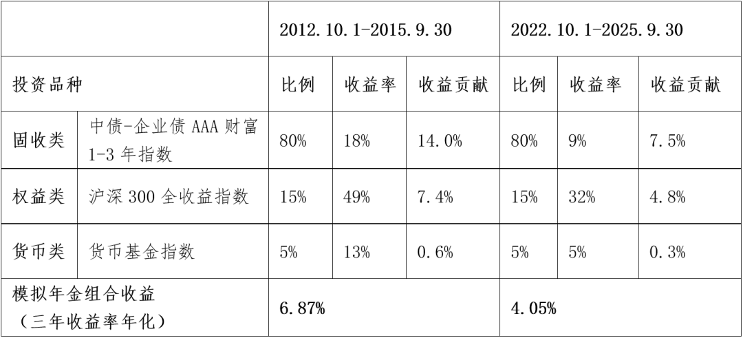 若固定收益类、权益类、货币类资产比例不变,最近三年(即2022年10月1日至2025年9月30日)此模拟年金组合的收益率从6.87%降至4.05%,权益类资产在组合的业绩贡献占比从33.6%上升至38.3%。即过去随着利率中枢不断下行,固收资产贡献下降,权益类资产贡献在上升,未来权益类资产在年金基金投资中将发挥越来越重要的作用。
