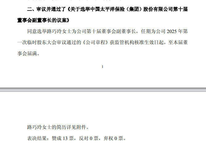 10月30日晚间,中国太平洋保险(集团)股份有限公司(601601.SH/02601.HK,下称“中国太保”)发布第十届董事会第十八次会议决议公告,同意选举路巧玲为第十届董事会副董事长,任期为2025年第一次临时股东大会审议通过的《公司章程》获监管机构核准生效日起,至本届董事会届满。同意提名周磊为第十届董事会非执行董事候选人,任期至本届董事会届满,并有资格在股东大会选举后连选连任。