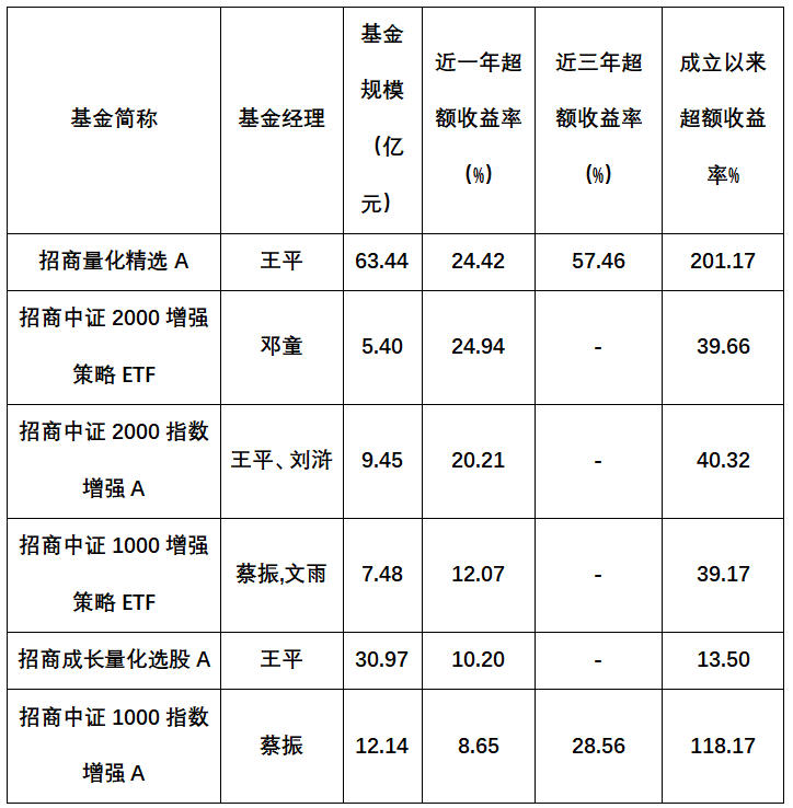 这套“慢”体系在业绩端也得到了验证。招商基金旗下量化产品中,多只近一年超额收益率超过10%(截至9月30日,取收益率更高份额,下同),其中招商量化精选A近一年超额收益达到24.42%,近三年和成立以来的超额收益率分别达到57.46%和201.17%。另外招商中证2000增强策略ETF和招商中证2000指数增强A的近一年超额收益率也超过20%。