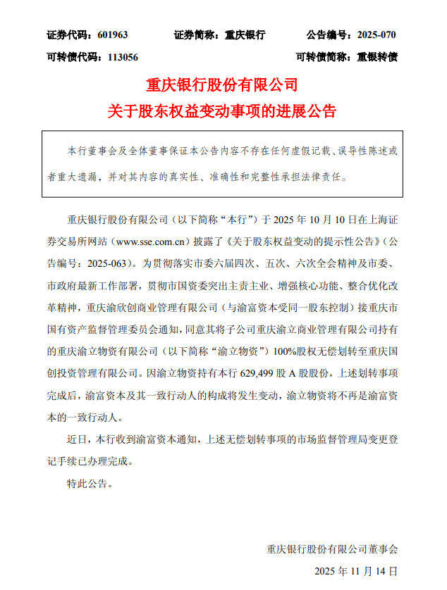 重庆银行表示,因渝立物资持有该行629499股A股股份,上述划转事项完成后,渝富资本及其一致行动人的构成将发生变动,渝立物资将不再是渝富资本的一致行动人。近日,重庆银行收到渝富资本通知,上述无偿划转事项的市场监督管理局变更登记手续已办理完成。