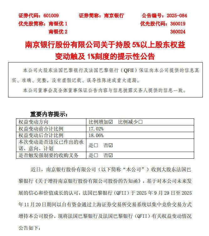 11月21日,南京银行股份有限公司(601009.SH,下称“南京银行”)发布公告称,近日,该行收到大股东法国巴黎银行《关于增持南京银行股份有限公司股份的告知函》,基于对南京银行未来发展的信心和价值成长的认可,法国巴黎银行(QFII)于2025年9月29日至2025年11月20日期间,以自有资金通过上海证券交易所交易系统以集中竞价交易方式增持该行股份1.28亿股,占该行总股本的1.04%。法国巴黎银行及法国巴黎银行(QFII)合计持股比例由17.02%增加至18.06%,触及1%整数倍。