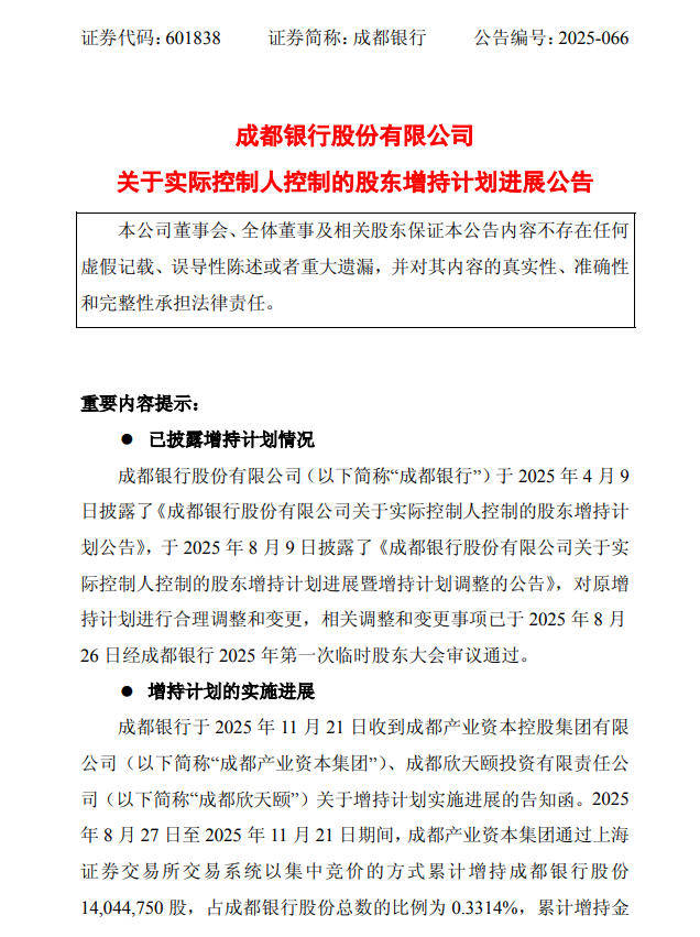 2025年8月27日至2025年11月21日期间,成都产业资本集团通过上海证券交易所交易系统以集中竞价的方式累计增持成都银行股份1404.48万股,占成都银行股份总数的0.3314%,累计增持金额为2.53亿元。目前成都产业资本集团的持股数量为2.57亿股,持股比例为6.0618%。2025年8月27日至2025年11月21日期间,成都欣天颐通过上海证券交易所交易系统以集中竞价的方式累计增持成都银行股份2020.22万股,占成都银行股份总数的0.4766%,累计增持金额为3.58亿元。目前成都欣天颐的持股数量为1.81亿股,持股比例为4.2737%。本次增持计划尚未实施完毕,成都产业资本集团、成都欣天颐将按照增持计划以自有资金继续增持成都银行股份。