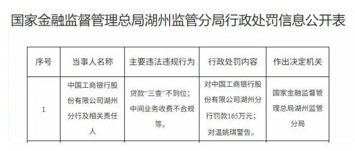 工商银行湖州分行因贷款“三查”不到位等问题被罚165万元