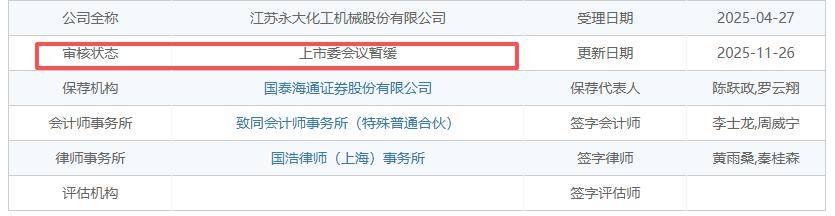 11月26日,北交所官网显示,江苏永大化工机械股份有限公司(以下简称永大股份)首发上会被暂缓审议。