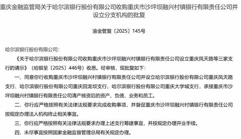 12月9日,国家金融监督管理总局重庆监管局集中批复,同意哈尔滨银行股份有限公司(下称“哈尔滨银行”)收购重庆市辖内两家村镇银行,并将其转变为该行在渝分支机构。