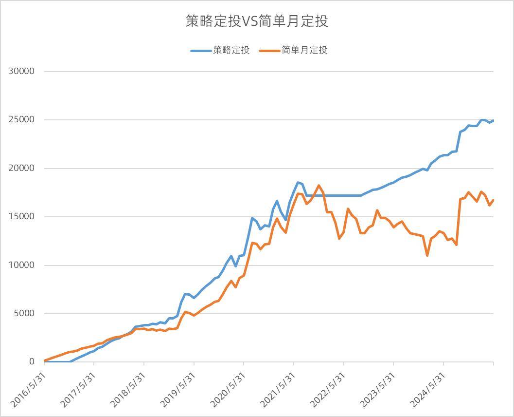 简单月定投为:每月月底定投固定金额,使总金额和策略定投累计投入金额一致。