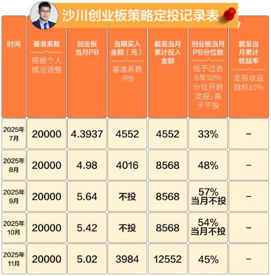 据了解,沙川设置的定投基础系数为20000,每期定投金额=20000/当前PB,2025年11月PB为5.02,低于过去6年50%分位,本期投入金额为:20000/5.02=3984元。
