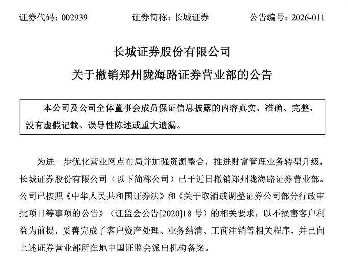 2月2日,长城证券股份有限公司(002939.SZ,下称“长城证券”)发布公告称,为进一步优化营业网点布局并加强资源整合,推进财富管理业务转型升级,已于近日撤销郑州陇海路证券营业部,并已向上述证券营业部所在地中国证监会派出机构备案。
