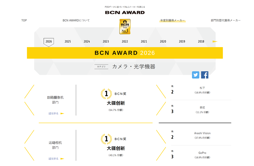 2026年1月19日,日本权威零售数据机构BCN+R将“数码摄相机”和“运动相机”两项年度大奖,授予了大疆Pocket和action系列。