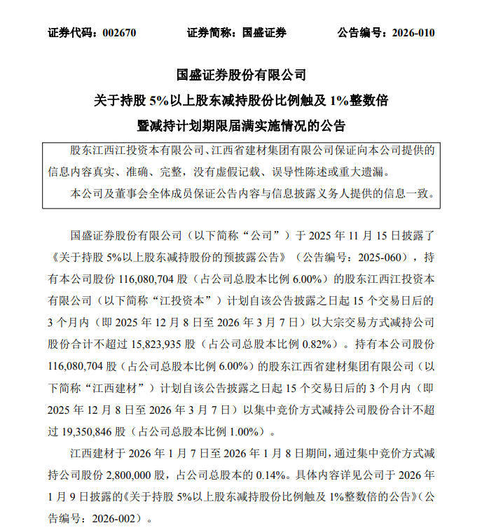 3月9日,国盛证券发布公告表示,2025年11月15日披露了《关于持股5%以上股东减持股份的预披露公告》,股东江西江投资本有限公司(以下简称“江投资本”)、江西省建材集团有限公司(以下简称“江西建材”)计划自该公告披露之日起15个交易日后的3个月内(即2025年12月8日至2026年3月7日)分别合计减持不超过0.82%和1%国盛证券股份。