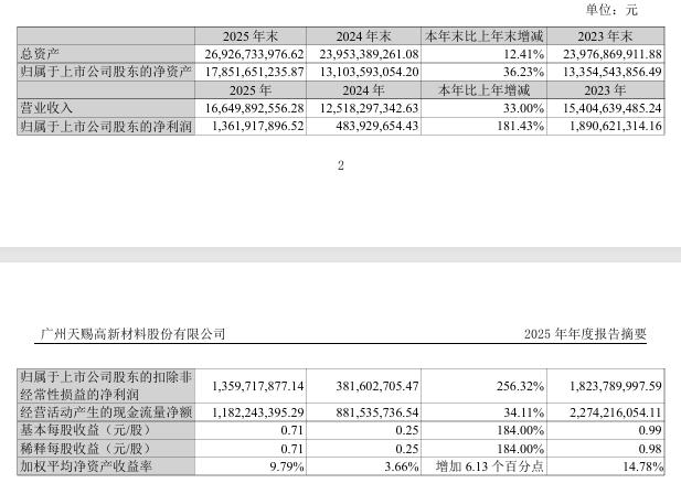 3月9日晚间,电解液龙头天赐材料(002709.SZ)披露2025年报。2025年,天赐材料实现营收166.50亿元,同比上升33.00%;实现归母净利润13.62亿元,同比上升181.43%;实现扣非净利润13.60亿元,同比上升256.32%。