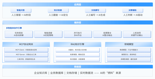 深度融合向量化检索、知识图谱与语义理解技术,构建统一企业知识中枢。支持内部知识库、MCP外部服务、实时网络检索多源融合,实现知识动态更新、溯源可证、精准检索、智能问答等能力。