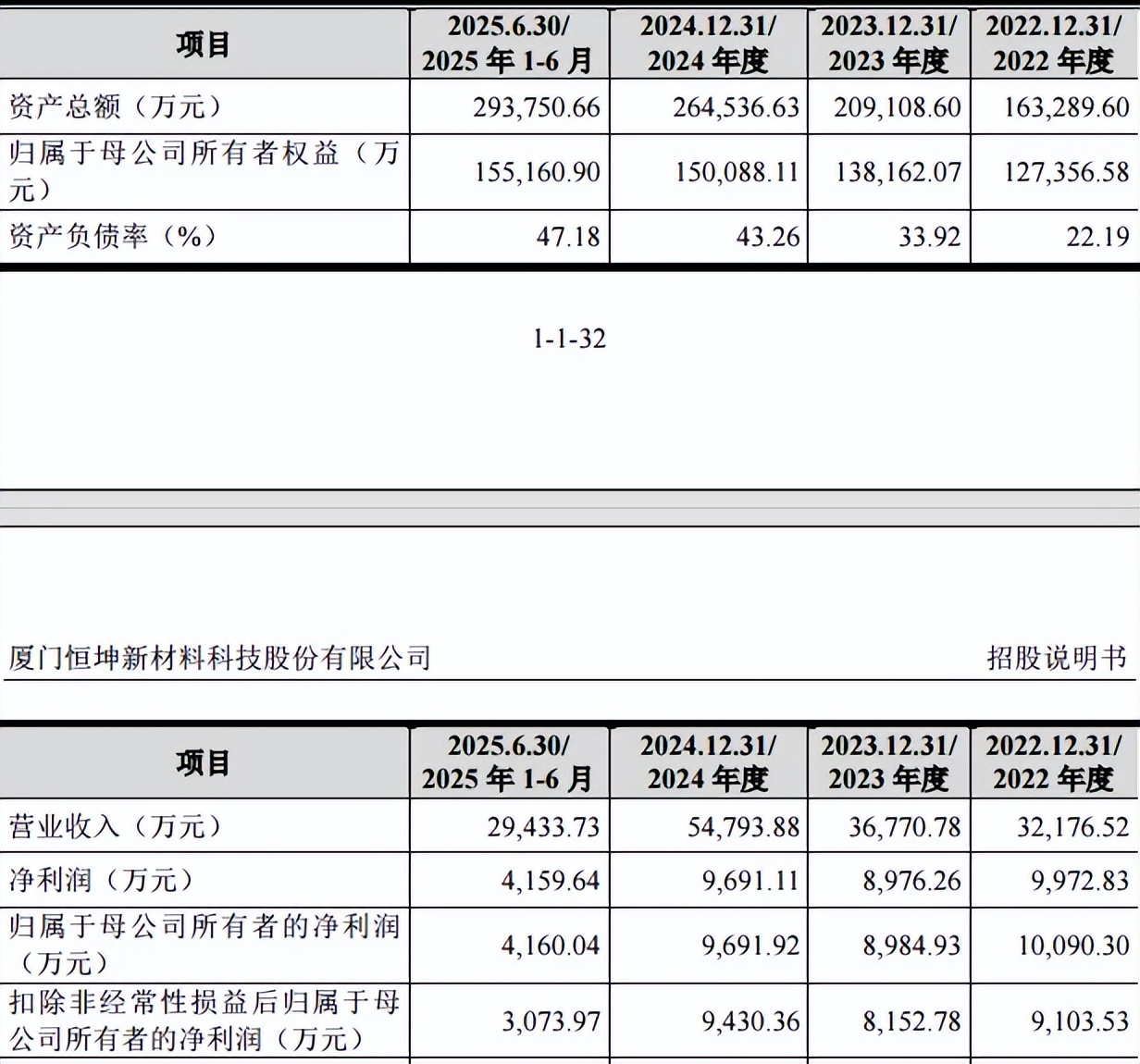 招股书显示,恒坤新材在2022年、2023年、2024年营收分别为3.22亿元、3.68亿元、5.48亿元;净利分别为9972.8万元、8976万元、9691万元;扣非后净利分别为9103.5万元、8152.78万元、9430万元。