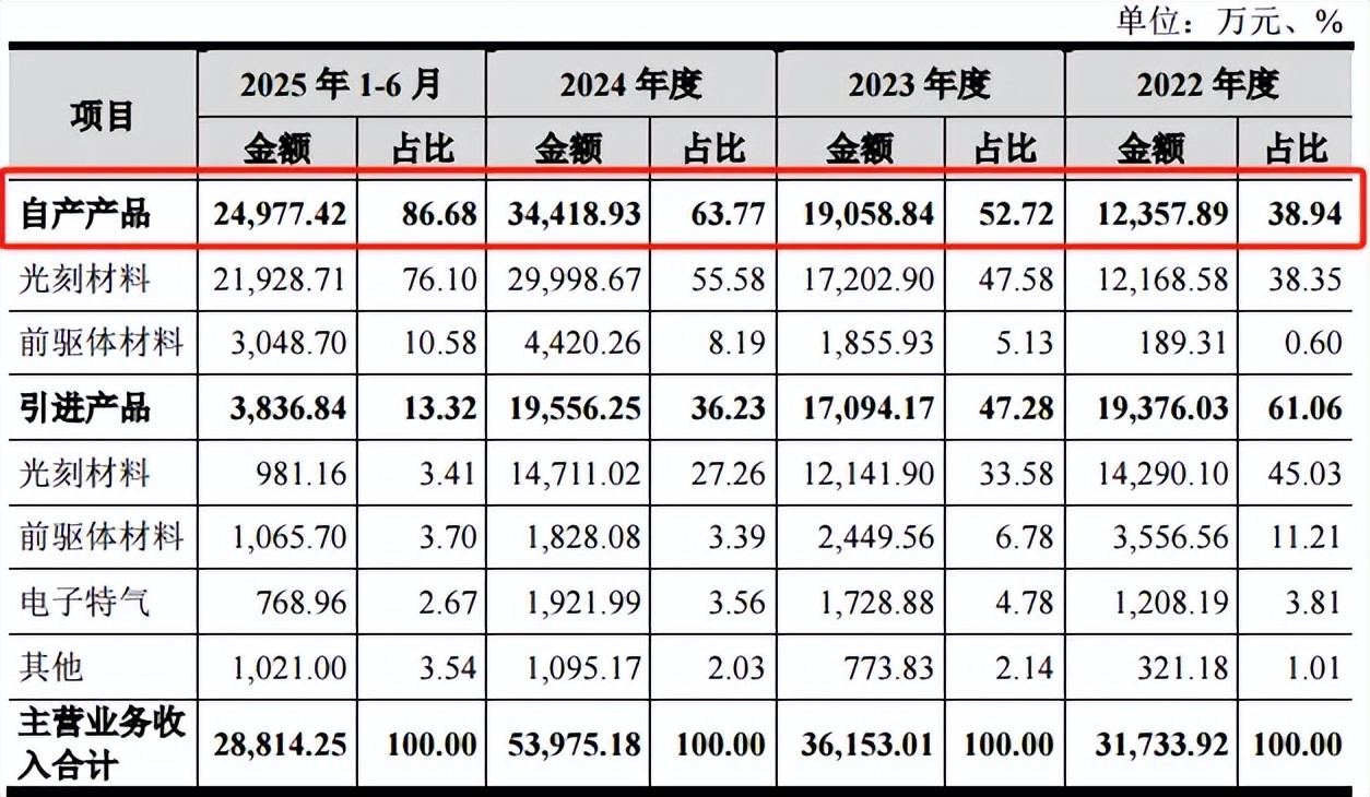 从2020年开始,恒坤新材自产的材料陆续通过多家客户验证并实现销售。招股书显示,报告期内恒坤新材自产产品收入规模和占比逐年上升,2022-2024年占主营业务收入的比例分别为 38.94%、52.72%和63.77%。