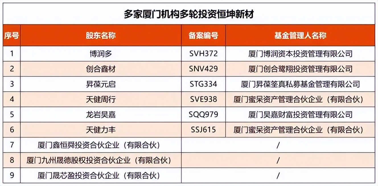 其中,厦门鑫恒舜投资合伙企业(有限合伙)、厦门九州晟德股权投资合伙企业(有限合伙)通过股权转让直接取得恒坤新材股份。另外,厦门蜜呆资产管理合伙企业(有限合伙)通过天健力丰基金、厦门昊嘉财富投资管理有限公司通过龙岩昊嘉基金、厦门博润资本投资管理有限公司通过博润多策略基金以股权转让的方式投资了恒坤新材。