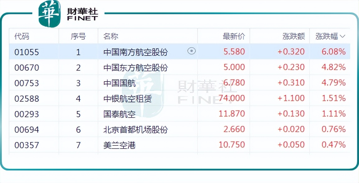 板块中,多只个股涨势可观,截至发稿前,中国南方航空股份(01055.HK)大涨6.08%,中国东方航空股份(00670.HK)涨4.82%,中国国航(00753.HK)涨4.79%,国泰航空(00293.HK)、美兰空港(00357.HK)等均涨。
