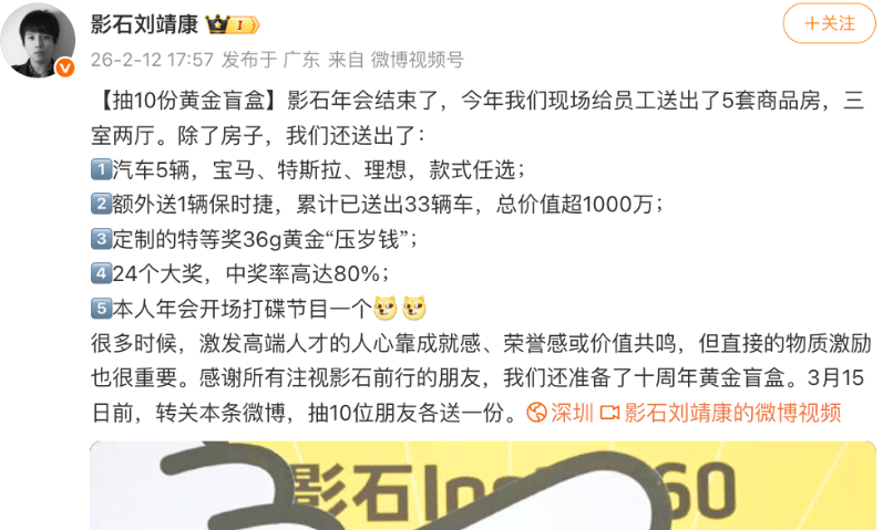 简直“壕无人性”!“影石年会送房送车送黄金”刷屏后,影石CEO刘靖康在次日(2月12日)下午再发“壕言”,除了送出5套三室两厅商品房(!!!),公司还送出了: