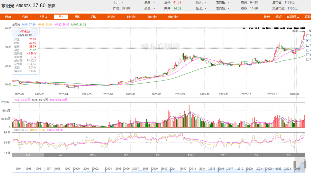 2025年至今,东阳光最高涨幅超339%,其股价最低时仅8.73元/股,而目前股价已高达37.8元/股。截至东阳光停牌,其总市值已高达1138亿元。但需要注意的是,前期股价一路飘红的东阳光,在复牌后能否继续高歌猛进还是未知数。
