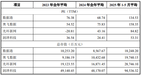 从2023年到2025年,秦淮数据的同业可比公司估值均有所上升,如数据港、奥飞数据、光环新网、润泽科技等,总市值平均增长率为83.89%,PE倍数最低增幅为45.9%。