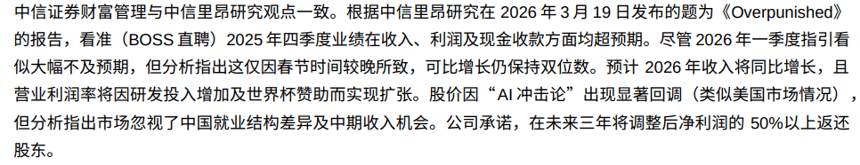 分析师认为,市场高估了替代平台的挑战。BOSS直聘凭借更丰富行为数据、更优模型与智能体能力,竞争优势将强化于同业,AI 工具亦可实现货币化。