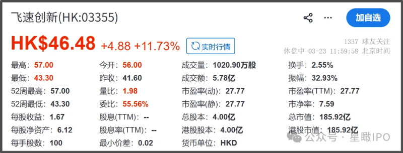 3月23日,飞速创新(03355.HK)正式登陆香港联交所主板,以56港元/股高开,至午市休盘,报46.48港元/股,上涨11.73%,总市值达185.92亿港元。