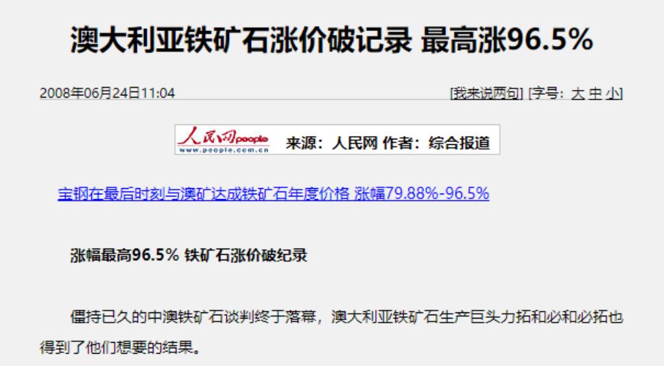 2008年时,力拓和必和必拓更加肆无忌惮。在日本新日铁已经与巴西淡水河谷达成协议价格之后,力拓与必和必拓竟然不愿遵守惯例,要求对中国的出口价格涨幅要超过淡水河谷。而中国企业最终也只能全盘接受。当年澳大利亚铁矿石涨幅高达96.5%。