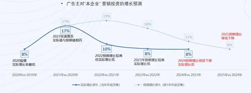 这并非个例。《2025中国数字营销趋势报告》调研显示,2025年广告主对营销投流持积极态度的比例下降14%,持悲观态度的比例上升11%。同时,广告主对营销带动增长的预期也从2021年的17%下滑至8%左右。