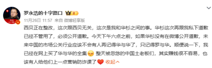 11月26日,周三,罗永浩的“限你下午6点前必须公开道歉”,成为最热门的顶流之一,仅在新浪微博平台就收获了多个热搜榜单。