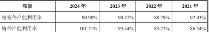 对于此次IPO,南特科技计划募集资金2.86亿元,其中2.47亿元用于安徽中特高端精密配件生产基地二期项目,3868.80万元用于珠海南特机加扩产及研发能力提升项目。而从当前公司核心产品产能利用率来看,的确已经相当饱和,公司募资扩产用于自身发展迫在眉睫。