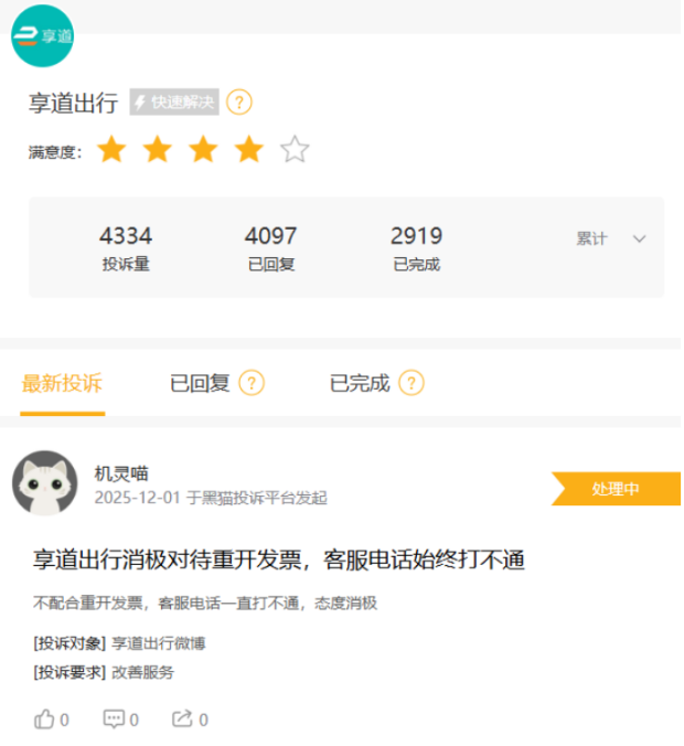 截至12月1日,在黑猫投诉平台检索“享道出行”,共包含4334条投诉内容,已完成2919条,其中,近30天投诉量达137条,已完成仅12条,投诉问题多涉及恶意退款、不予退款、乱扣司机费用等,投诉方司机乘客皆有涉及。
