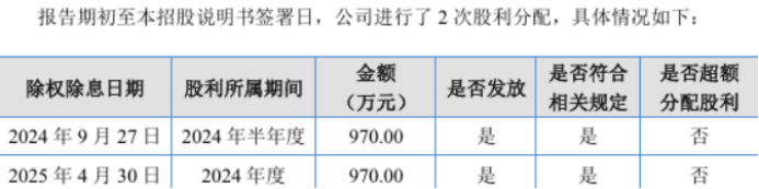 报告期初至本招股说明书签署日,公司进行了2次股利分配,两次分别派发现金红利970万元,合计分红1940万元。而根据持股比例,实控人通过此次分红至少1000万元落袋为安。