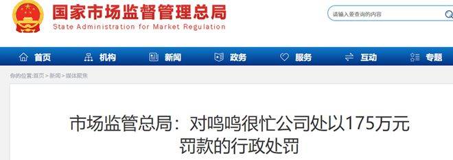 鸣鸣很忙也曾被监管部门处罚。2024年5月,高安市市场监管局发布抽样检验不合格食品核查处置公示(第二批),其中高安市赵一鸣零食瑞阳东区店经销的玫瑰鱼(香辣味)涉嫌生产环节超范围使用食品添加剂,具体为苯甲酸及其钠盐项目不符合GB 2760-2014《食品安全国家标准食品添加剂使用标准》要求,检验结论为不合格,违反了食品安全法,监管部门对其处以没收违法所得、罚款的措施。