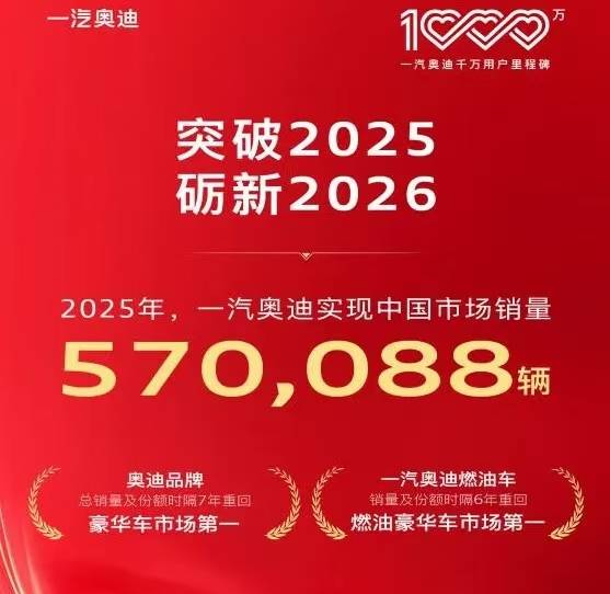 2026年伊始,一汽奥迪高调宣布全年中国市场销量达到零售570,088辆,批发566,988辆,宣称燃油车销量及份额时隔六年重回燃油豪华车市场第一,国产燃油车销量及份额持续保持国产燃油豪华车市场第一。然而,这一“销冠”声明却如空中楼阁,充满了虚幻与争议。