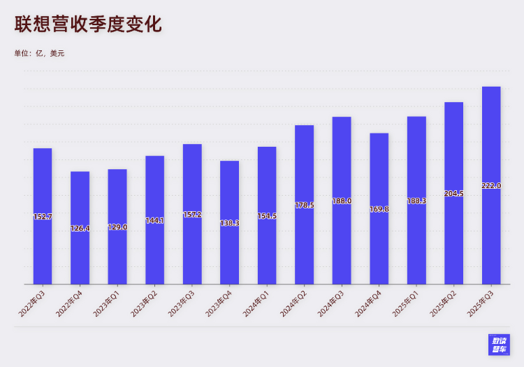 截至2025年第三财季,联想营收222亿美元,同比增长18%。