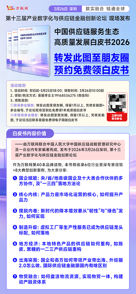 由万联网联合中国人民大学中国供应链战略管理研究中心以及一众业内专家重磅编制的《中国供应链服务生态高质量发展白皮书2026》,核心收录了6位专家经验+8大创新升级的典型案例,从国企赋能本地产业、提升产品力,到韧性安全与绿色发展、产业带出海、物贸一体布局,旨在帮助困在“纯垫资贸易”的供应链公司(尤其是地方国企),找准转型升级的方向,打造除“资金优势”外的其他核心竞争力。